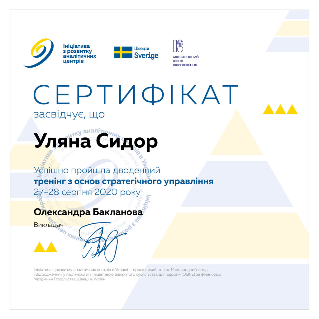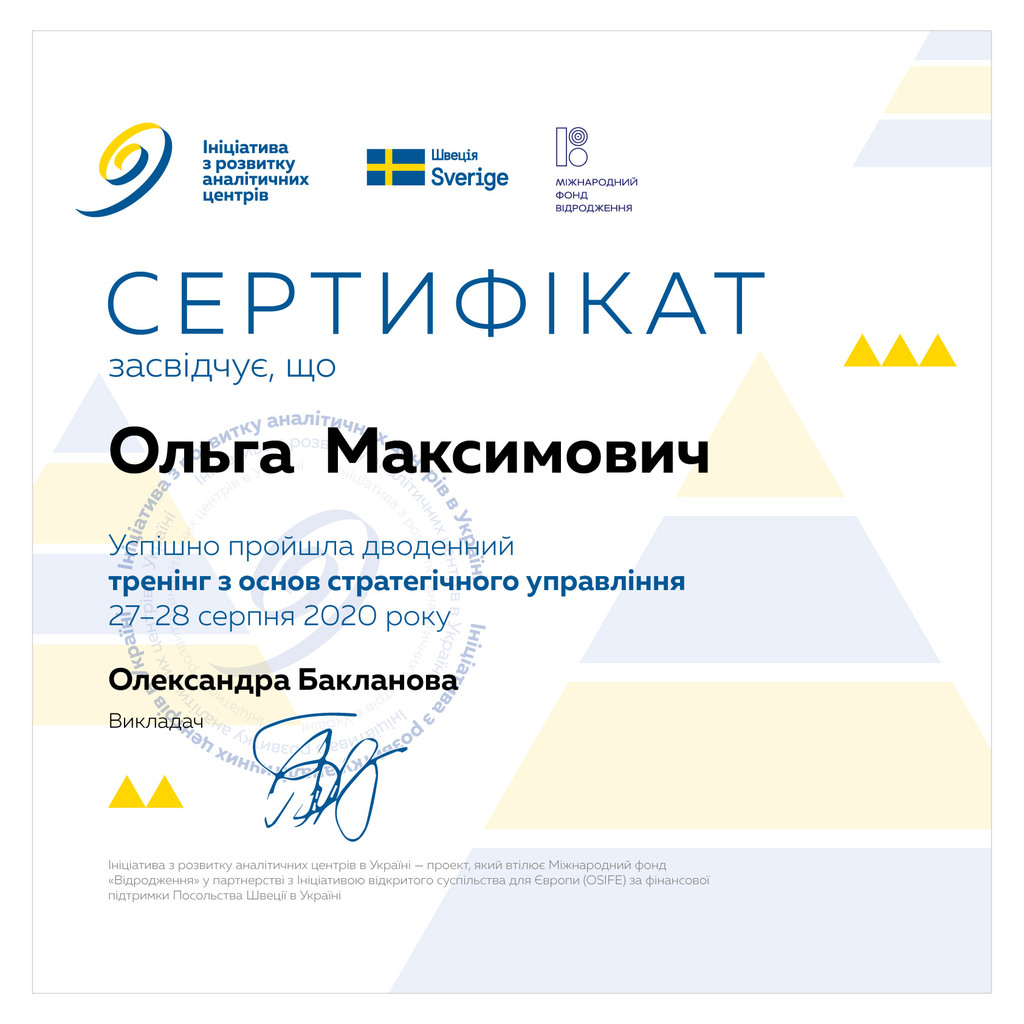 В рамках Ініціативи з розвитку аналітичних центрів, яку виконує Міжнародний фонд «Відродження» за фінансової̈ підтримки Посольства Швеції̈ в Україні співробітники Центру (директорка підрозділу Ольга Максимович, провідна фахівчиня, фінансова менеджерка та аналітикиня Уляна Сидор, експерт з доброго врядування, публічного управління та доброчесності Роман Пятківський та головний науковий співробітник, експерт статистичного аналізу даних Михайло Осипчук) пройшли тренінг з основ стратегічного планування.