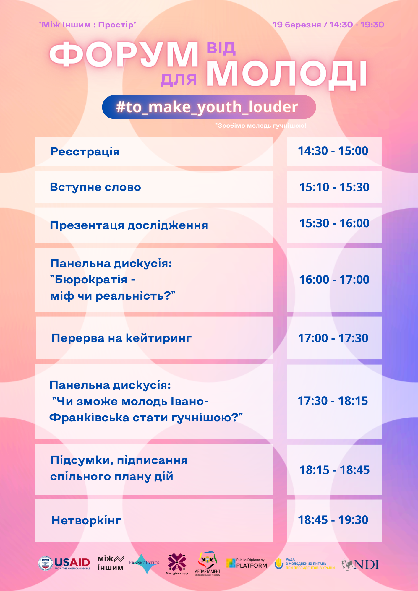 Проєкт “#to_make_youth_louder” реалізується Громадською Організацією “Між Іншим” спільно з Карпатським інститутом аналітики “FrankoLytics” у партнерстві із Молодіжною радою при МВК МР ІФМТГ та Департаментом молодіжної політики та спорту у рамках грантової програми від ГО “Платформа Публічної Дипломатії” та Національного Демократичного Інституту. Фінансування є можливим завдяки щирій підтримці американського народу через Агентство США з міжнародного розвитку USAID.